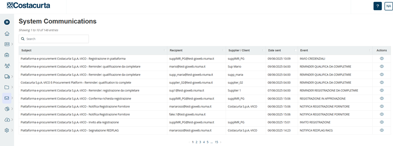 - System Communications: contains the list of communications sent by the platform to both internal users and suppliers. Communication visibility is based on the user profile configuration. It is possible to view the details of the content, relative to the message, using the Actions column (Figure 1), with a click on the wink icon.