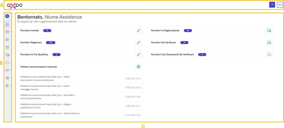 - Fornitori Registrati, (B) che indirizza alla pagina Lista Fornitori filtrata per Stato = Registrato.