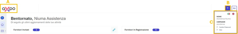 All’interno dell’header, è visualizzabile sia il logo aziendale (A) (rif. Figura 3) sia l ’area utente (C) in cui è presente il nome e l’username dell’utenza, la possibilità di selezionare la lingua di visualizzazione del portale tra Italiano/Inglese ed infine, è possibile effettuare il cambio password e il Log-out.