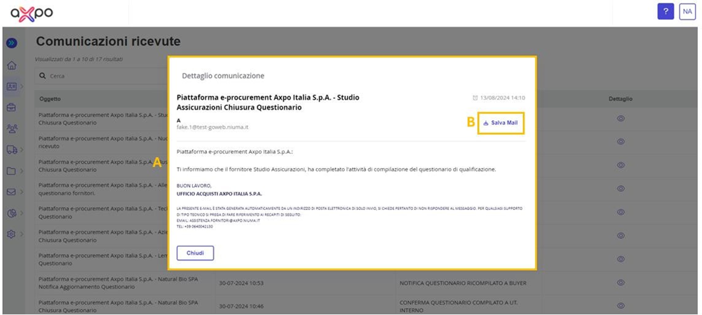 All’interno del pop-up, l’utente ha la possibilità di salvare la mail in oggetto, cliccando sul pulsante in alto a destra “Salva Mail” (B).
