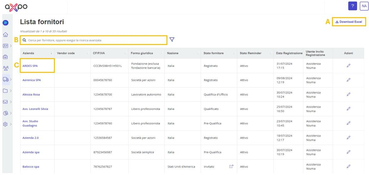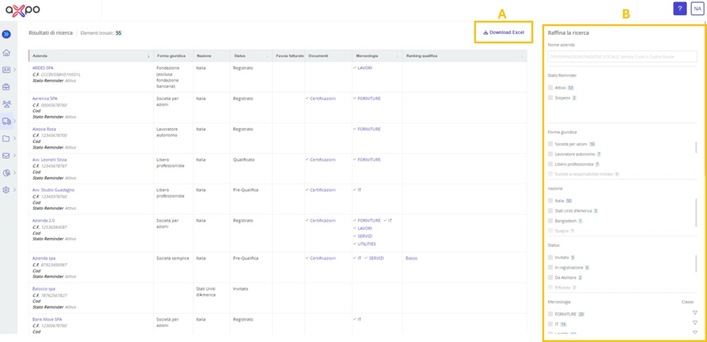 In aggiunta, l’utente interno ha la possibilità di effettuare un’estrazione dei fornitori, cliccando sul pulsante “Download Excel” (A), situato in alto a destra della pagina, con l’eventualità di poter effettuare una selezione dei fornitori utilizzando lo strumento del filtro di ricerca (B).