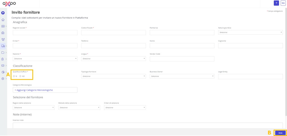 3. Invito alla registrazione: questa sezione consente di invitare un determinato fornitore a registrarsi sul portale tramite il pulsante “Invia” (B). In particolare, una volta inseriti i dati richiesti, specialmente quelli obbligatori contraddistinti da (*), il sistema invierà una mail al fornitore con la relativa comunicazione.