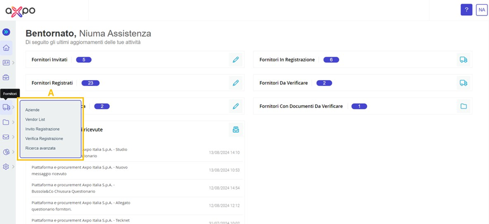 - Vendor List - elenco di tutti i fornitori che hanno compilato il questionario di qualifica e inserito la documentazione richiesta
