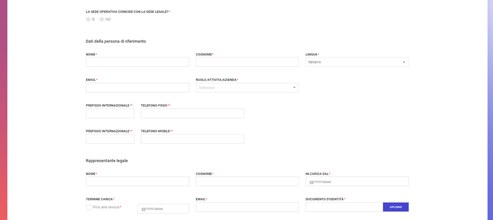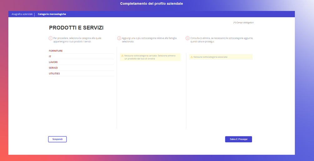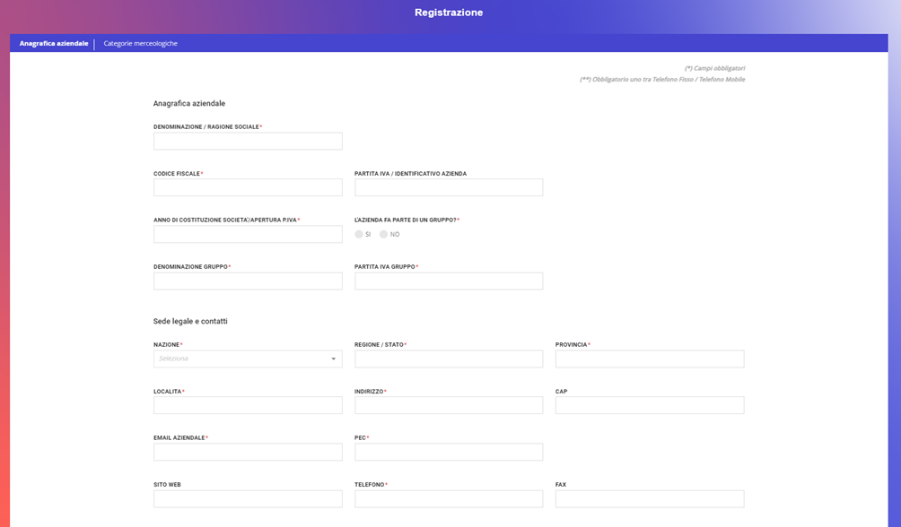 Al fine di completare il processo di registrazione, il fornitore deve procedere con la compilazione dei vari moduli, necessari ad inquadrare il profilo aziendale.