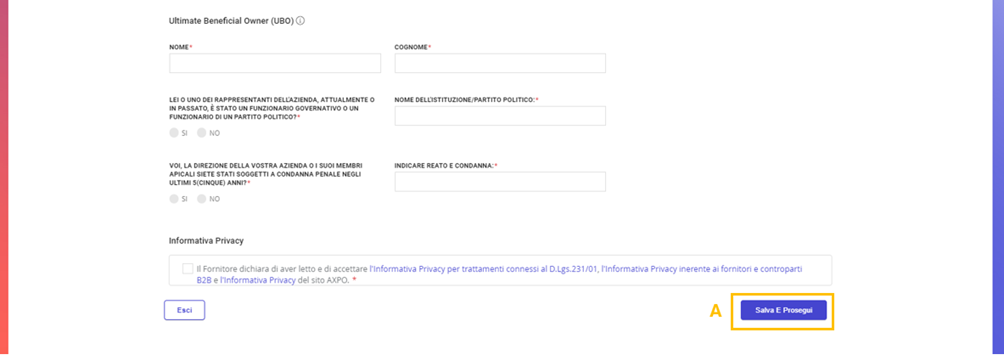 Dopo aver compilato tutti i campi, per procedere con la registrazione, cliccare su Salva e prosegui (A) (in basso a destra – rif. Figura 3).