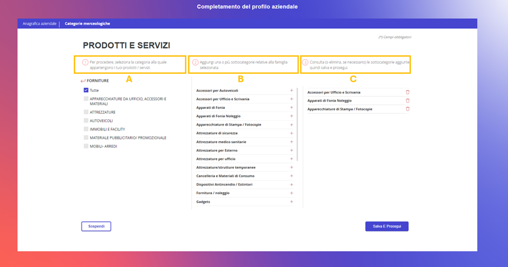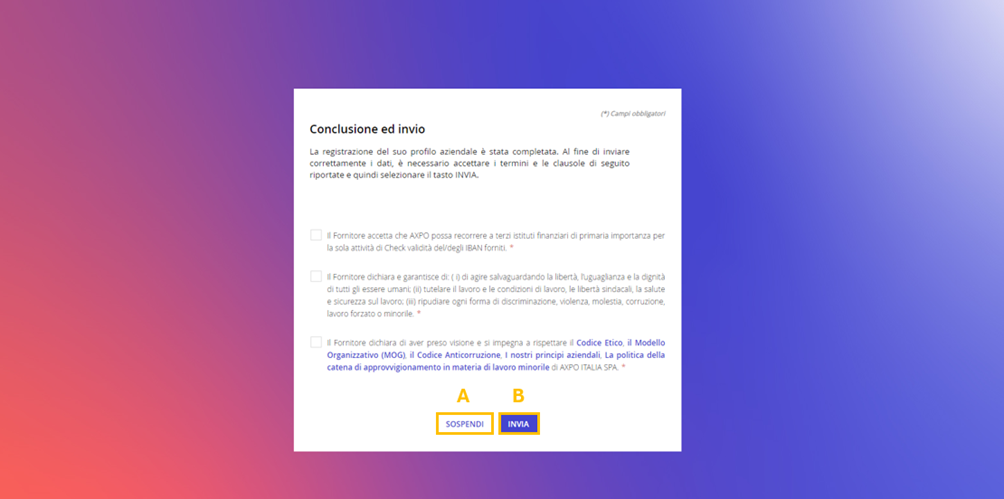 Una volta selezionate le voci, fare click su Invia (B) per terminare la registrazione (rif. Figura 6). Qualora l’utente clicchi sul pulsante Sospendi (A), il sistema sospenderà il flusso di registrazione del fornitore, che potrà terminarlo in un secondo momento utilizzando il token.