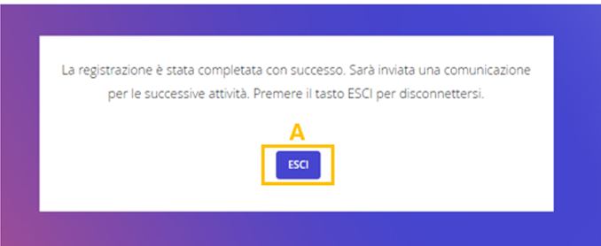 Se tutto il procedimento di registrazione è andato a buon fine, si aprirà la pagina (rif. Figura 7) contenente la seguente dicitura: “La registrazione è stata completata con successo. Sarà inviata una comunicazione per le successive attività. Premere il tasto ESCI per disconnettersi”.