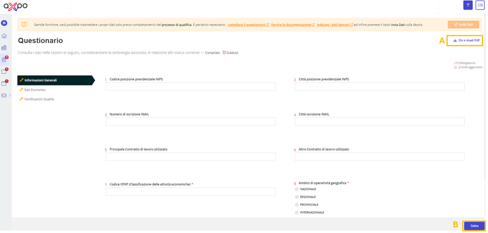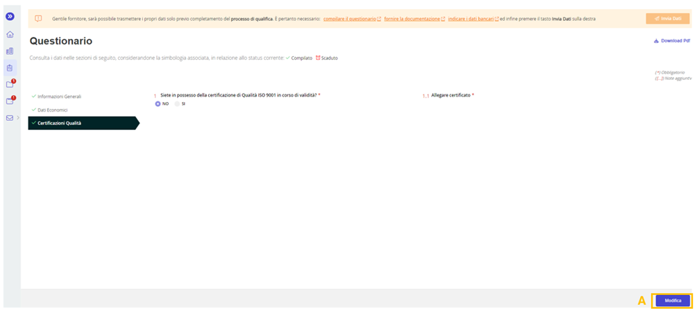 Qualora il fornitore abbia bisogno di scaricare il file relativo al questionario, potrà cliccare sul pulsante “Download pdf” (A) presente su tutte le pagine.