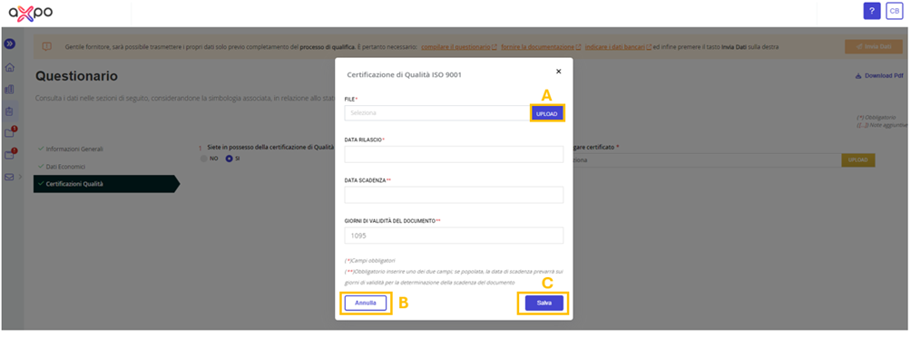 Durante la compilazione dei questionari, il fornitore può allegare i documenti (obbligatori e non) richiesti (rif. Figura 13) utilizzando il pulsante Upload (A) e inserendo la data di emissione della documentazione in oggetto. Al fine di salvare l’inserimento del documento, il fornitore dovrà procedere cliccando sul pulsante Salva (C); al contrario qualora volesse tornare indietro senza salvare l’inserimento, utilizzare il tasto Annulla (B) (rif. Figura 13)