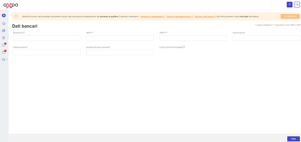 All’interno dei moduli, i campi contrassegnati con un asterisco (*) sono campi obbligatori; tuttavia, si consiglia di compilare tutti i campi, al fine di fornire ad Axpo più dati possibili dell’azienda fornitrice.
