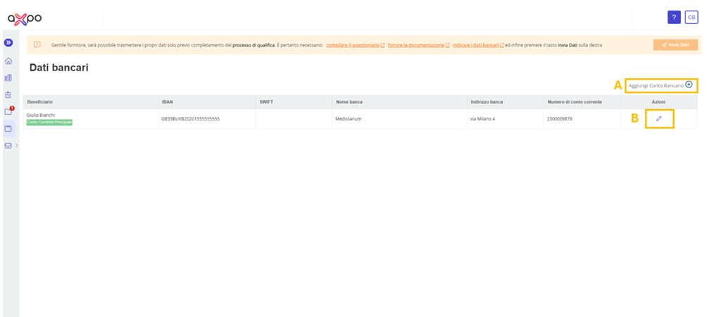 Inoltre, cliccando sull’icona presente all’interno della colonna “Azioni” è possibile modificare i dati di un conto corrente già censito (B) (rif. Figura 15).