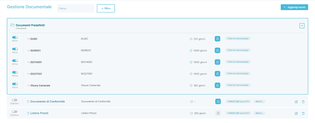 La sezione Gestione Documentale contiene i riferimenti dei Documenti che possono essere richiesti ad un Fornitore.