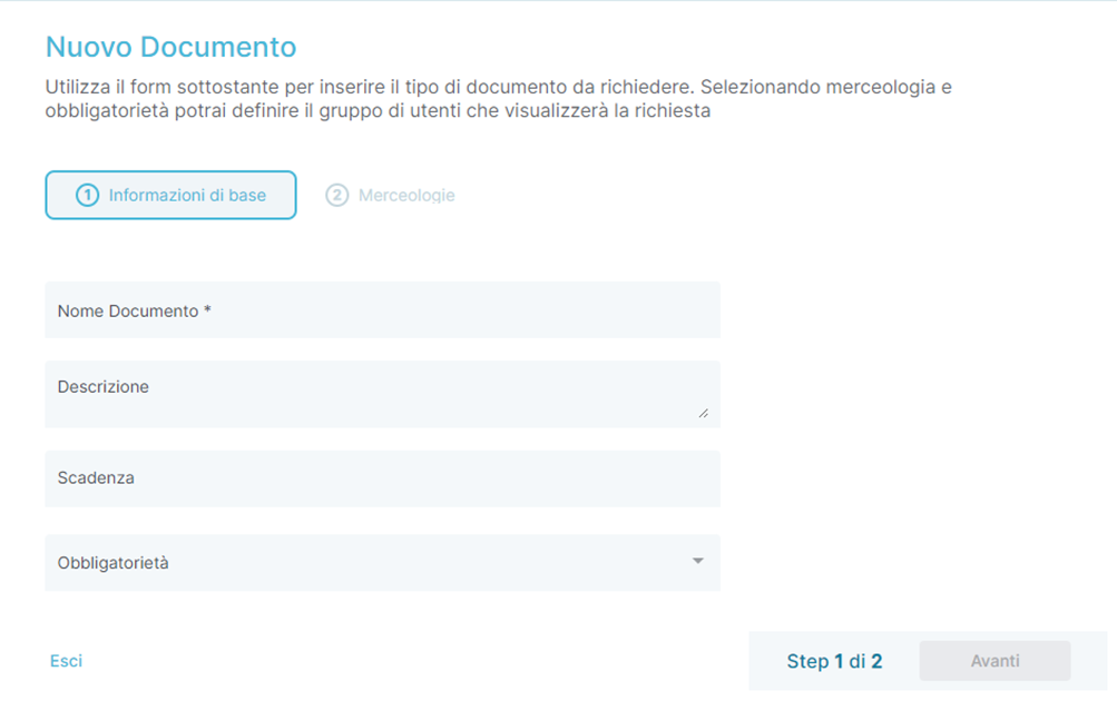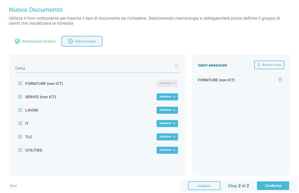 - Se Documento Custom, le Merceologie possono essere indicate in fase di creazione del Documento e modificate successivamente; il Documento viene richiesto ai soli Fornitori aventi la Merceologia corrispondente a quella configurata per il Documento