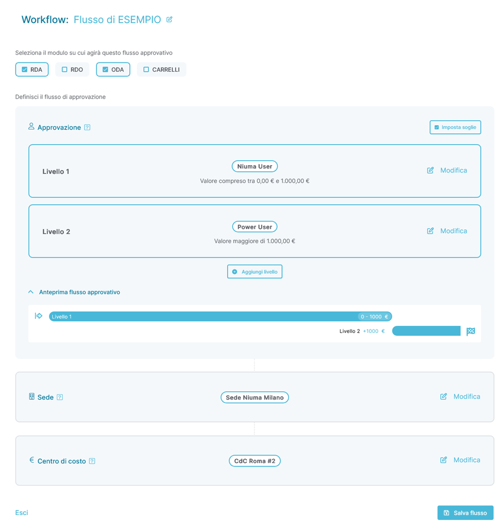 - Da questa sezione è possibile configurare le Sedi su cu insiste il flusso approvativo