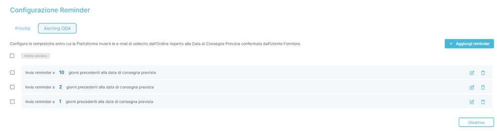 Il Portale invia notifiche al Fornitore in base ai reminder ODA configurati in questa sezione per tutte le Posizione di un Ordine che non siano state finalizzate dall’Utente interno del Portale (