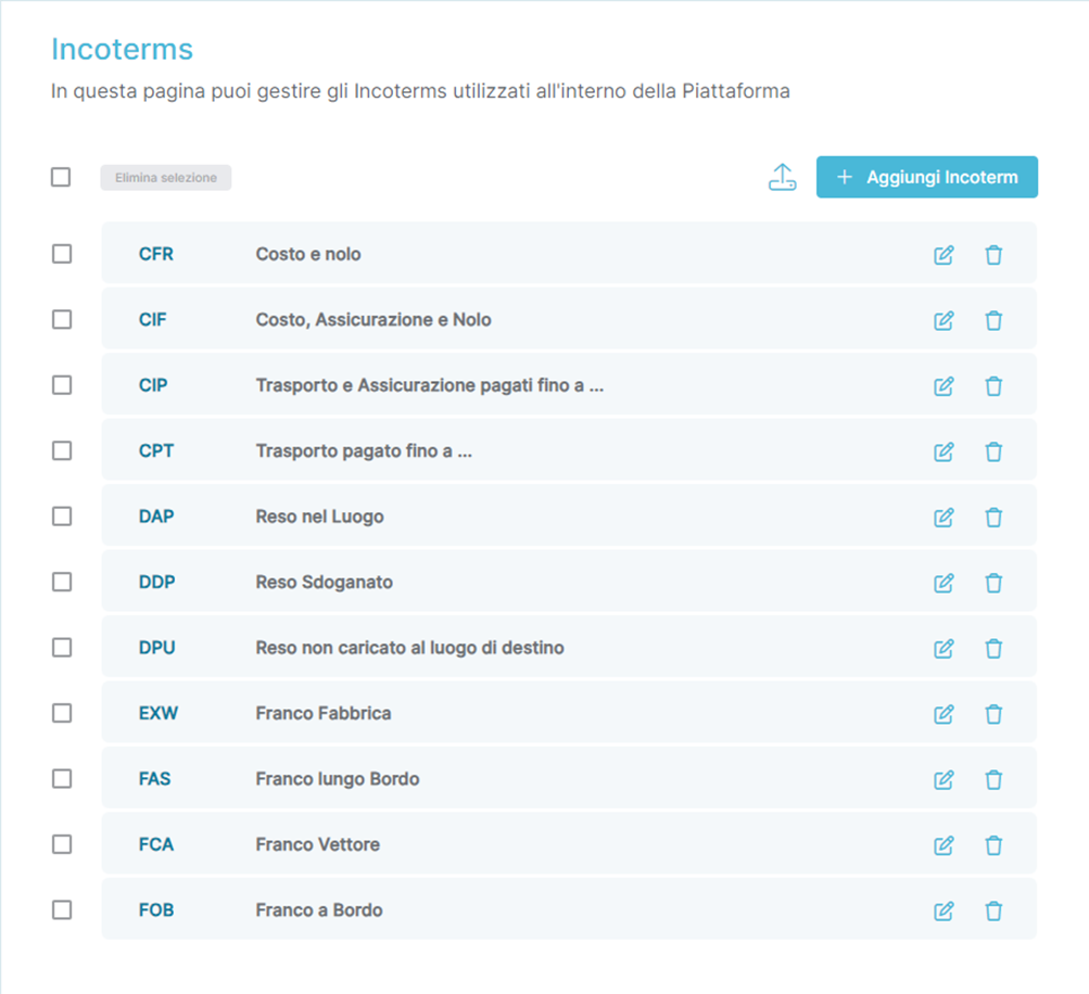 ) l’Incoterm - Aggiungere manualmente un Incoterm direttamente dal bottone