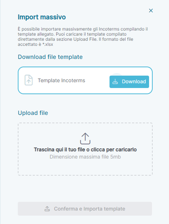 - La pressione del bottone aprirà una sezione alla sinistra del Portale dove è possibile scaricare il template massivo da ricaricare direttamente in Piattaforma con gli Incoterm da importare. Segue schermata della sezione: