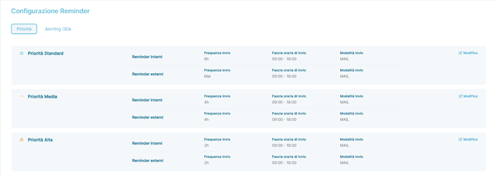 - IMPORTANTE: In caso di disattivazione degli Alert il Portale invierà solo le e-mail basate sulla configurazione delle Priorità (vedi sezione Configurazione reminder – Priorità)