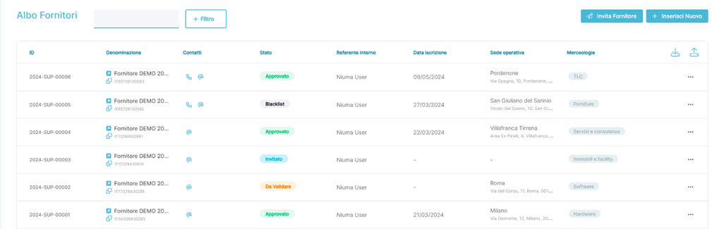 - Stato: Indica lo stato del Fornitore in Piattaforma