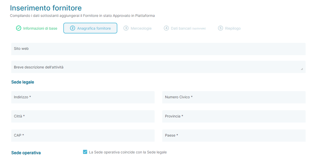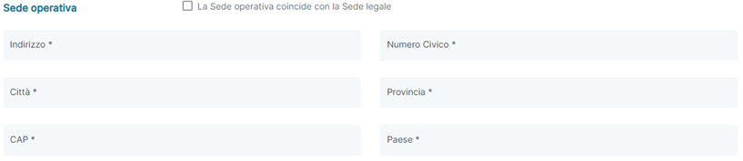 - Sede Operativa: permette di indicare se la Sede operativa coincide con la Sede Legale del Fornitore