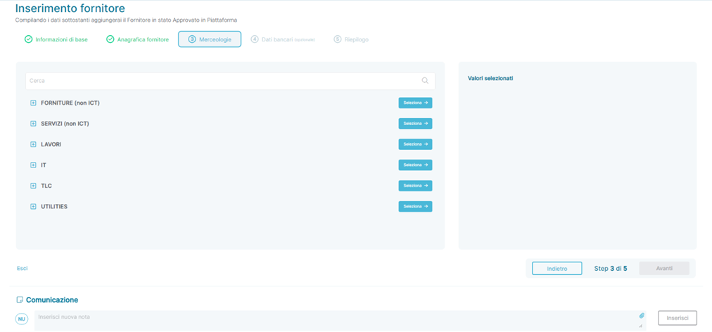 La terza pagina dello stepper è dedicata al censimento dell’Anagrafica fornitore, da dove è possibile effettuare l’associazione delle Merceologie al Fornitore
