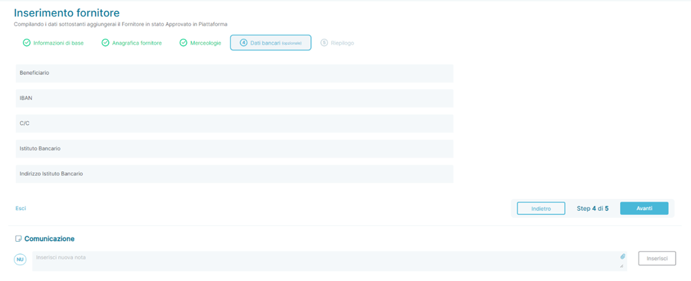 La quarta pagina dello stepper è dedicata all’inserimento delle coordinate bancarie del Fornitore (Dati Bancari)