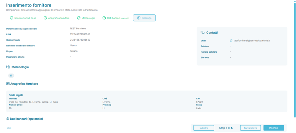 La quinta e ultima pagina dello stepper permette di visualizzare un riepilogo dei dati immessi nelle sezioni precedenti: