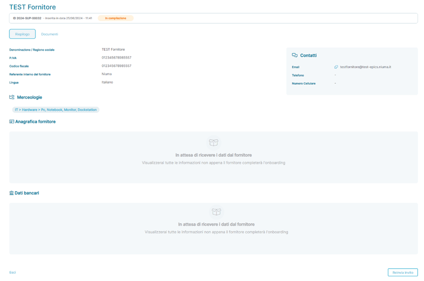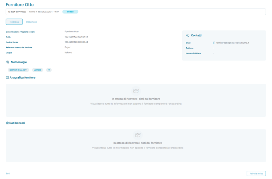 In questo stato applicativo il Fornitore non ha completato il ciclo di Onboarding e non tutte le informazioni di dettaglio del Fornitore possono non essere presenti. In questa fase è possibile soltanto reinviare l’invito al Fornitore contenente il Link per l’avvio del processo di Onboarding dal bottone