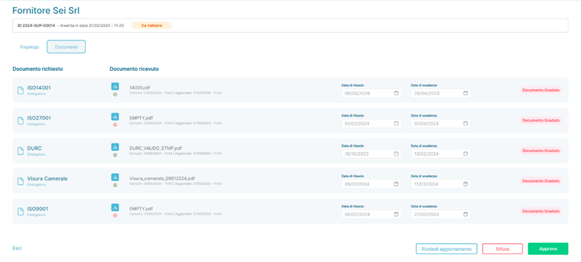 - Per i Fornitori in stato Da Validare
