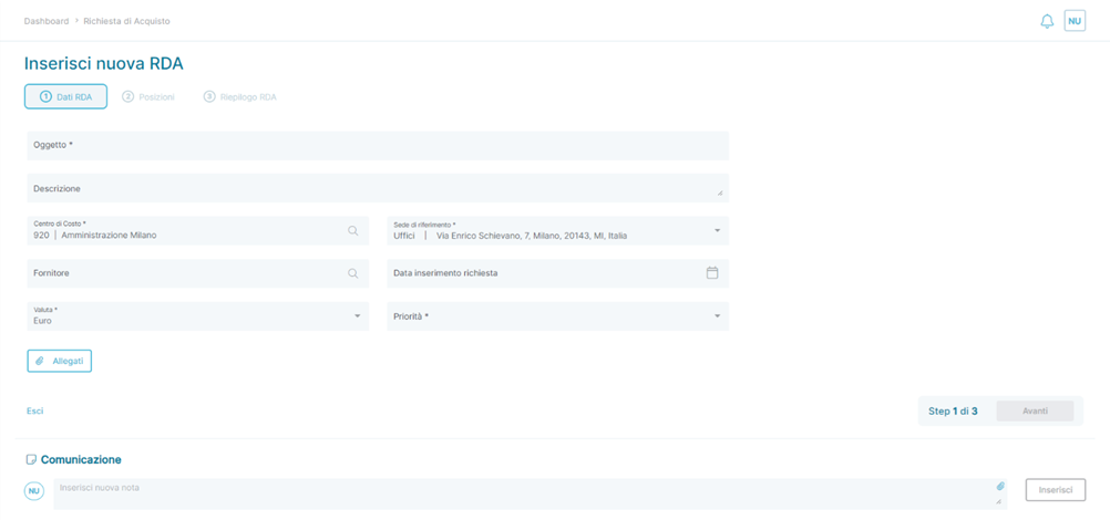 La creazione di una Richiesta di Acquisto è suddivisa in tre step: