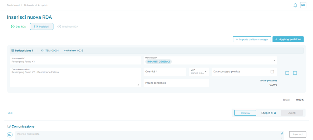 La sezione Posizioni permette l’inserimento di tutte le Posizioni legate alla Richiesta di Acquisto sia manualmente che importati da Item Manager.