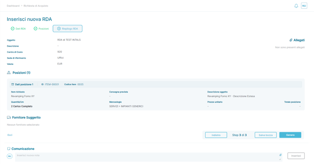 IMPORTANTE: Il completamento della Richiesta di Acquisto può avvenire solo al passaggio della RDA in stato Approvata, che può essere raggiunto automaticamente alla pressione del bottone ‘Genera’ se non sono presenti flussi approvativi che insistono sulla RDA oppure, in caso di flussi approvativi attivi che insistono sulle informazioni immesse nella specifica RDA, può essere raggiunto solo dopo che tutti gli Utenti approvatori coinvolti nel flusso approvativo hanno concluso l’iter approvativo (vedi sezione Impostazioni -> Add-On -> Workflow approvazione per maggiori dettagli)