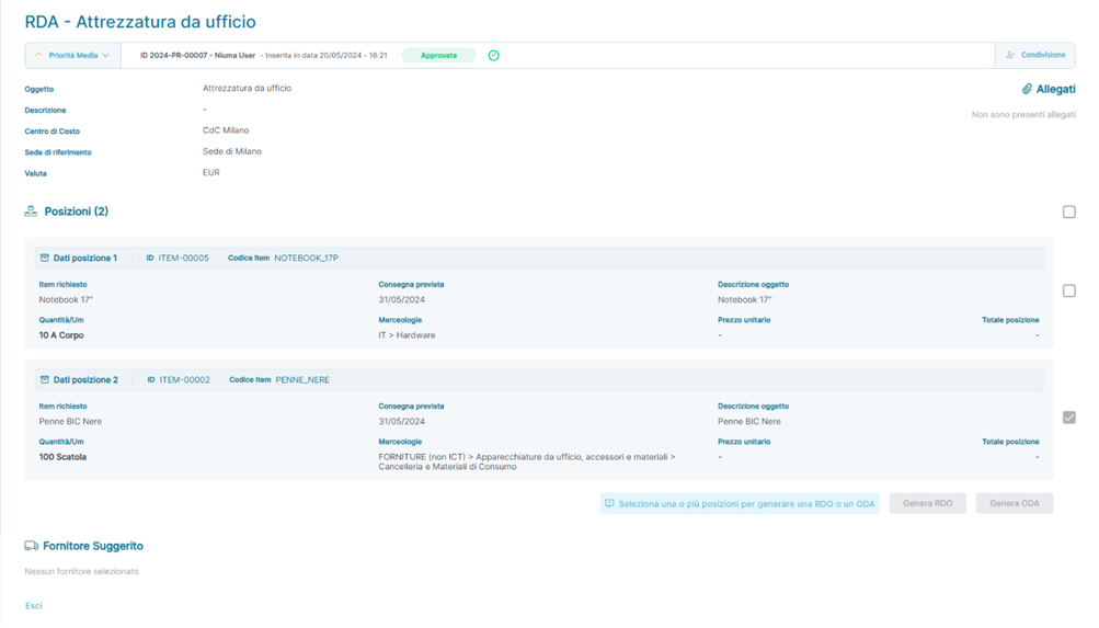, oppure le Posizioni residue non sono state ancora selezionate, la Richiesta di Acquisto impedirà di compiere azioni mostrando i bottoni di generazione RDO e ODA in grigio