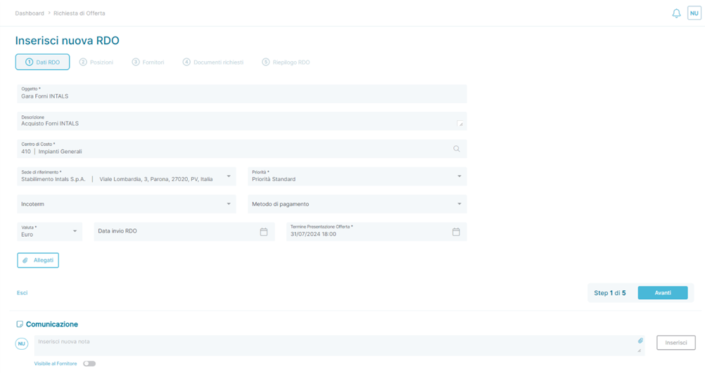 Incoterm | Permette di indicare un Incoterm associato alla Richiesta di Offerta | Opzionale |