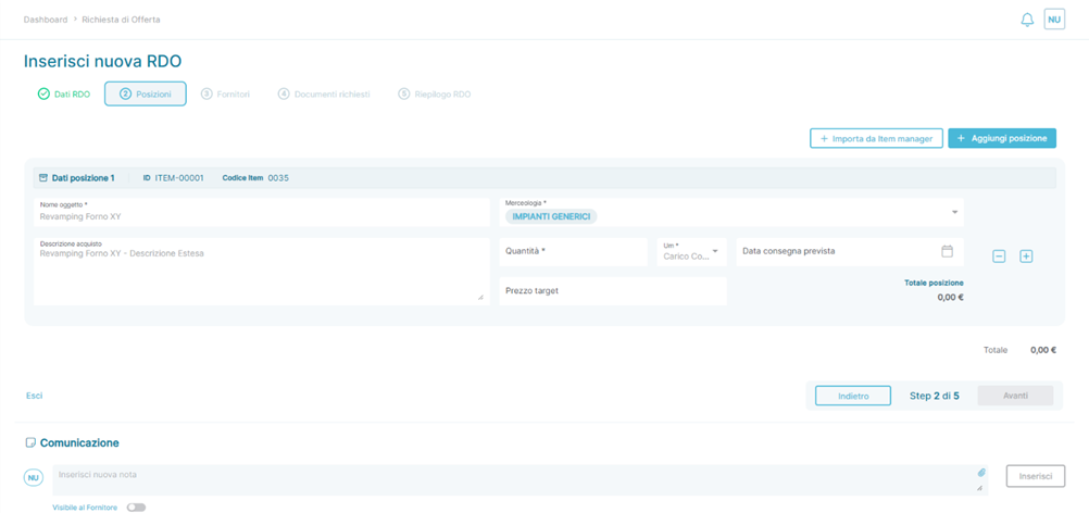 La sezione Posizioni permette l’inserimento di tutte le Posizioni legate alla Richiesta di Offerta sia manualmente che importati da Item Manager.
