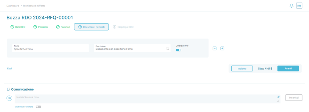 La richiesta di documenti al Fornitore è opzionale. Nel caso in cui l’autore della RDO decidesse di inserirne uno (o più), le informazioni da inserire sono: