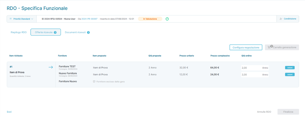 Esempio sezione Offerte ricevute di una Richiesta di Offerta (RDO) passata in stato In Valutazione