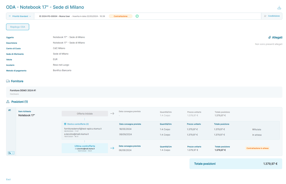 - L’Utente di Piattaforma accede al Riepilogo ODA, dal quale può controllare tutte le Posizioni presenti all’interno dell’Ordine, tra cui quelle oggetto di proposta di modifica di Data di Consegna, Quantità, Unità di Misura e/o Prezzo Unitario