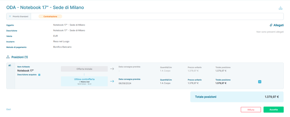 , che possono essere premuti dall’Utente di Piattaforma o dall’Utente Fornitore in base alla fase di Contrattazione in cui si trova l’Ordine, cioè se il Fornitore ha inviato una proposta di modifica alla Data di Consegna, Quantità, Unità di Misura e/o Prezzo Unitario per almeno una Posizione oppure se l’Utente di Piattaforma ha a sua volta proposto una modifica alla Data di Consegna, Quantità, Unità di Misura e/o Prezzo Unitario in risposta ad una proposta di modifica alla Data di Consegna, Quantità, Unità di Misura e/o Prezzo Unitario da parte del Fornitore: i bottoni di accettazione e rifiuto sono visibili solo agli Utenti che devono effettivamente decidere in merito alla proposta inviata dall’altro Utente.