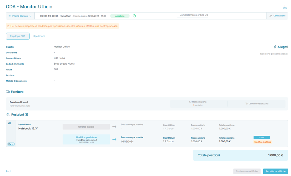 Esempio #1 sezione Proponi Modifica di un Ordine di Acquisto (ODA) in stato Accettato - Vista Fornitore