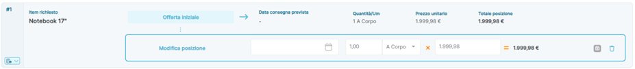 in seguito alla richiesta formale di modifica di Data di Consegna, Quantità, Unità di Misura e/o Prezzo Unitario di almeno una Posizione afferente all’Ordine da parte del Fornitore, è previsto che l’Utente di Piattaforma analizzi la proposta di modifica alla Data di Consegna, Quantità, Unità di Misura e/o Prezzo Unitario inviata dal Fornitore per una o più Posizioni. In dettaglio: