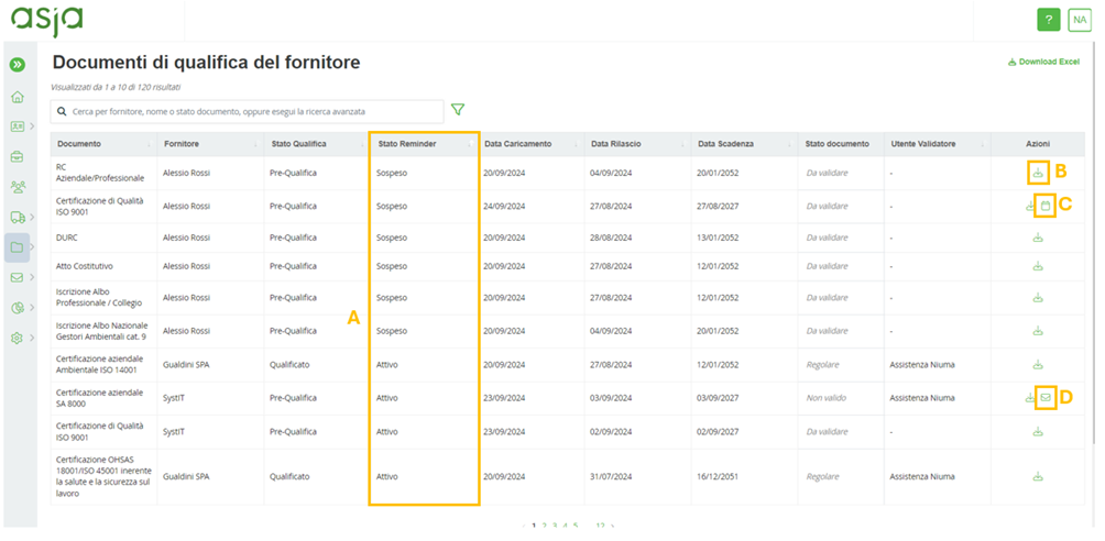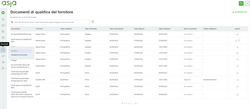 - Qualifica: questa sezione contiene tutti i documenti caricati sul portale di e-procurement dal fornitore. L’elenco associa ad ogni documento presente nel portale: il fornitore dal quale è stato caricato, lo stato di qualifica del fornitore, la data di caricamento del documento a sistema, la data in cui il documento è stato rilasciato al fornitore, la data di scadenza del documento, lo stato, l’utente che ha validato il documento e lo stato reminder.