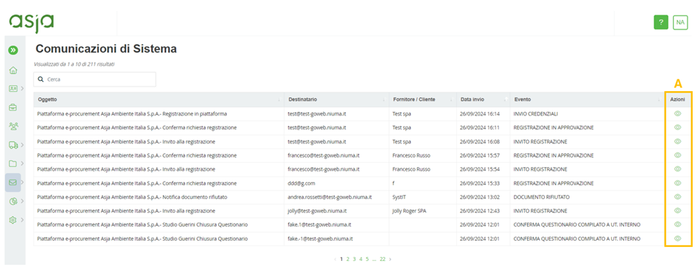 Attraverso l’area Comunicazioni, è possibile visualizzare tutte le comunicazioni di sistema inviate sia agli utenti interni sia ai fornitori (rif. Figura 21).