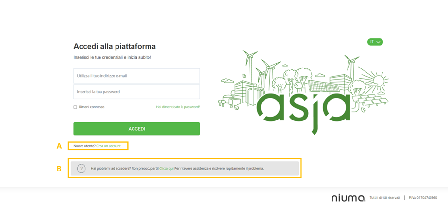 Per procedere con la registrazione, sarà necessario entrare nella pagina di Login In, cliccare sul pulsante “Crea un account” (A) (rif. Figura 1).