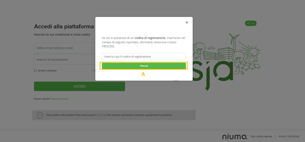 Successivamente, si aprirà una maschera in cui inserire il codice di pre-attivazione (token) ricevuto via e-mail e cliccando sul pulsante “Procedi” (A) (rif. Figura 2) si viene indirizzati all’interno del form di registrazione.