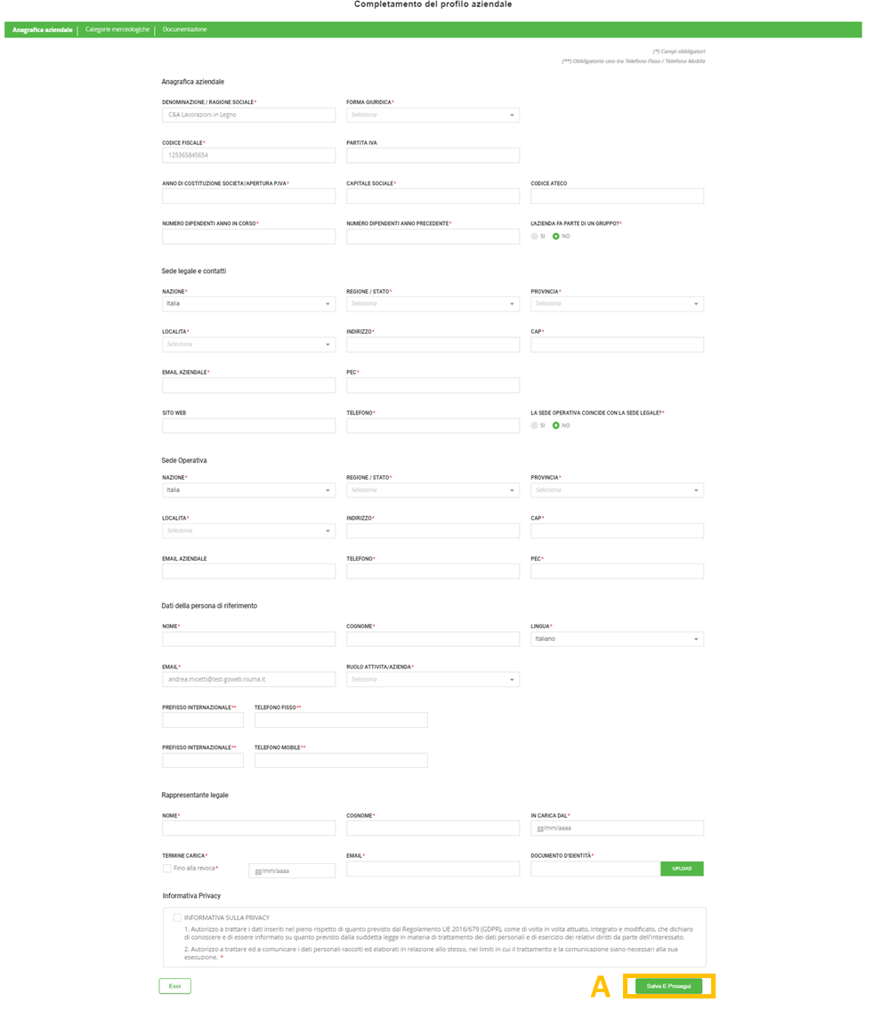 - inserire i dati richiesti per completare l’anagrafica aziendale;