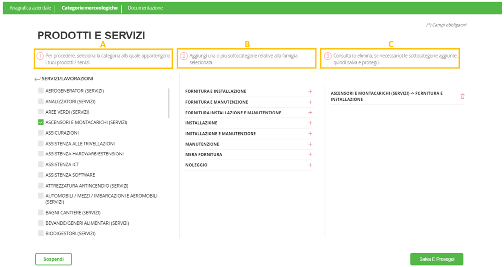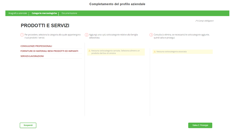 Una volta selezionate le merceologie è necessario cliccare su Salva e prosegui per poter procedere con la registrazione.