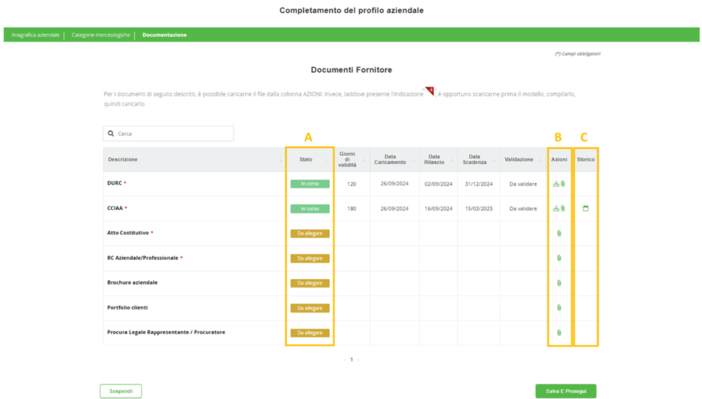 In questa sezione il fornitore ha la possibilità di caricare i documenti richiesti utilizzando l’icona e scaricare la documentazione che ha allegato tramite l’icona , presenti all’interno della colonna AZIONI (B) (rif. Figura 6). Infine, ha la possibilità di visualizzare lo storico di tutti i documenti allegati – qualora ne abbia allegato più di uno – cliccando sull’icona all’interno della colonna Storico (C) (rif. Figura 6).