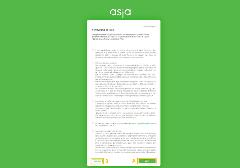 Una volta selezionate le voci, fare click su Invia (A) per terminare la registrazione (rif. Figura 7). Qualora l’utente clicchi sul pulsante Sospendi (B), il sistema sospenderà il flusso di registrazione del fornitore, che potrà terminarlo in un secondo momento utilizzando il token.