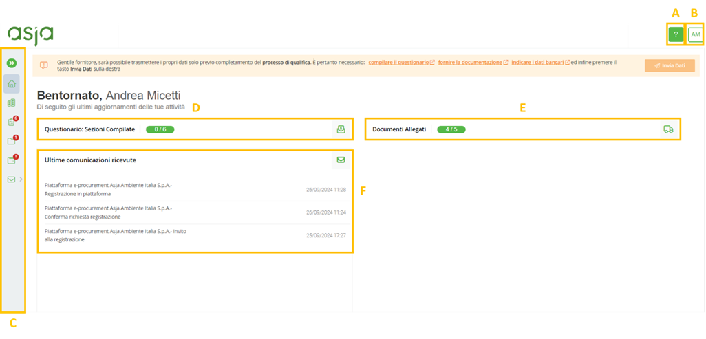C. Menu principale (C): attraverso tale menu, il fornitore può visualizzare e modificare i dati dell’azienda, i questionari, i documenti, i propri dati bancari e le comunicazioni ricevute.